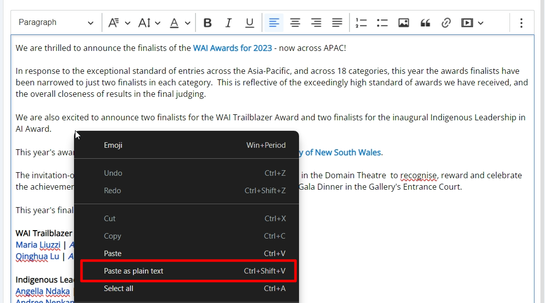 If you are copying and pasting text from online pages, documents, or emails, for example, paste the text as âplain textâ, holding Ctrl + Shift + V.