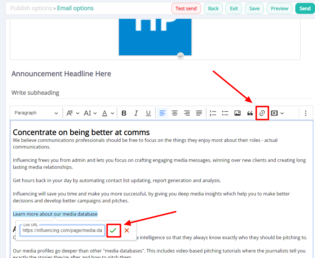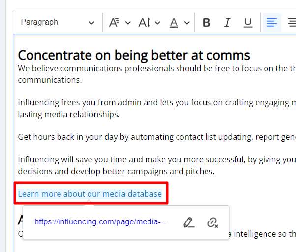 To add hyperlinks (links that redirect people to websites when they click on the highlighted words), select a word or phrase, click on the Hyperlink icon, insert the URL you want and click ok.
