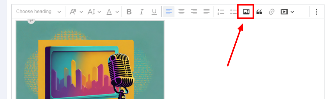 To add images to your text, click on the Image icon > Upload > Choose file > select your image > click on Send it to server.