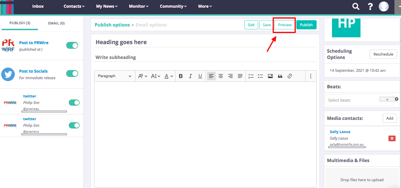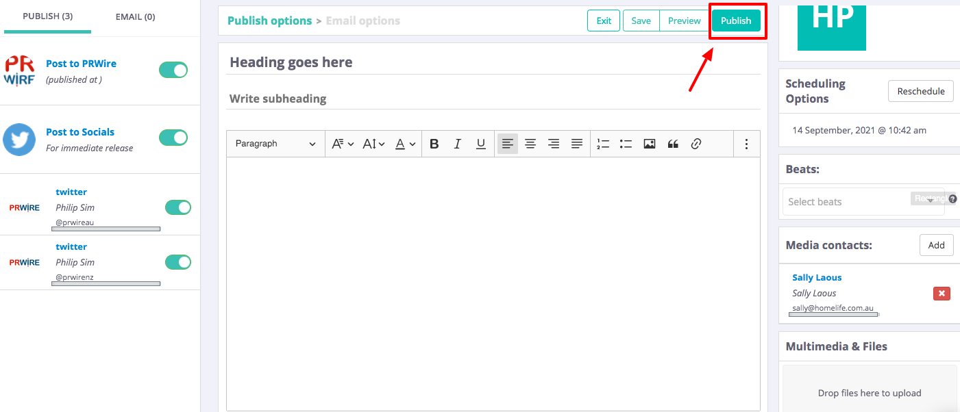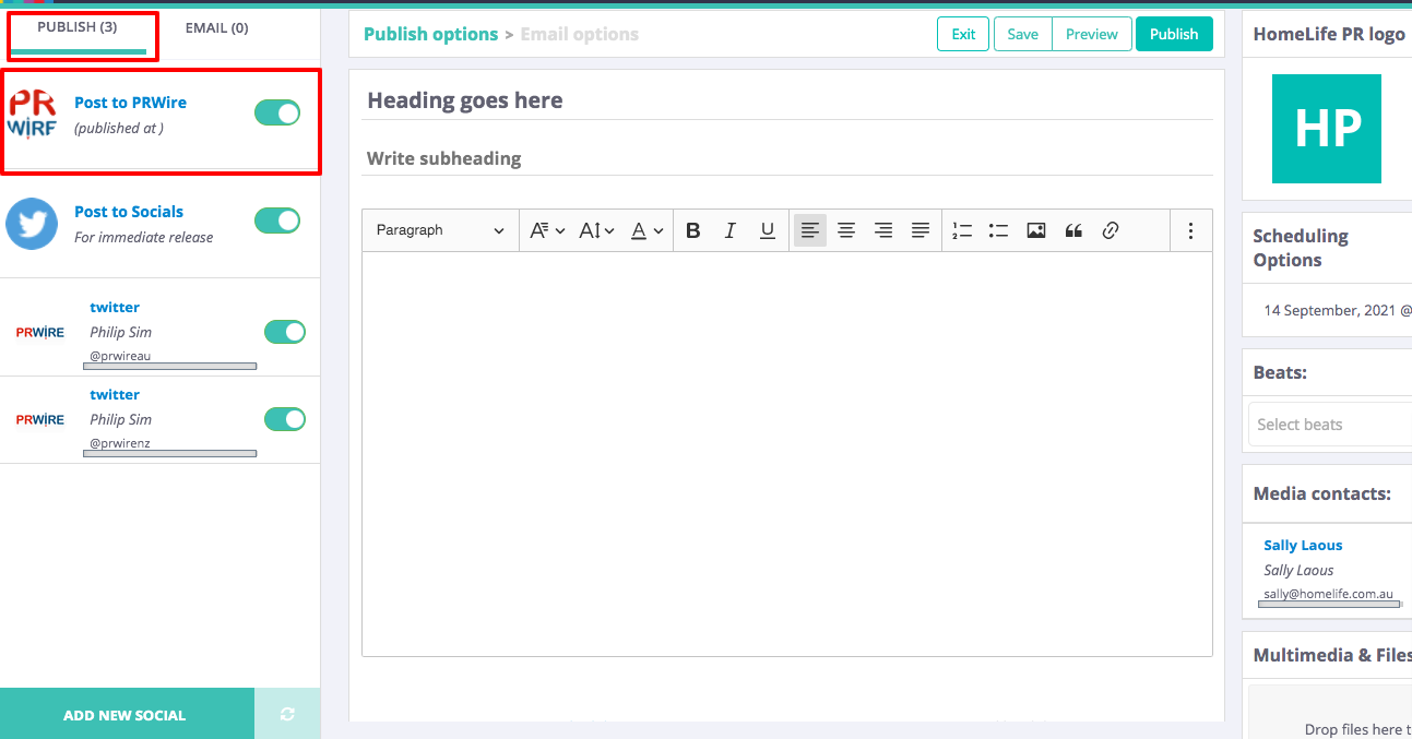 Go to 'PUBLISH' to choose your release to be published to PRWire and Influencing websites. You can also modify and preview the text for the web distribution.