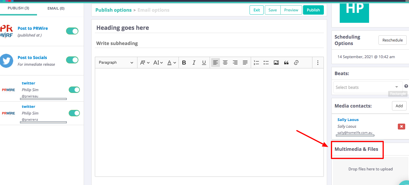 Attach additional documents or images to go with your release. Just click on the Multimedia & Files button to choose your files or simply drag them there.