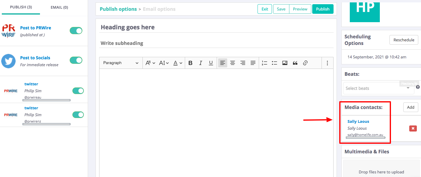 Remember to add Media Contacts for your release so journalists can contact you. Simply click on 'Add' if you're not already listed there.