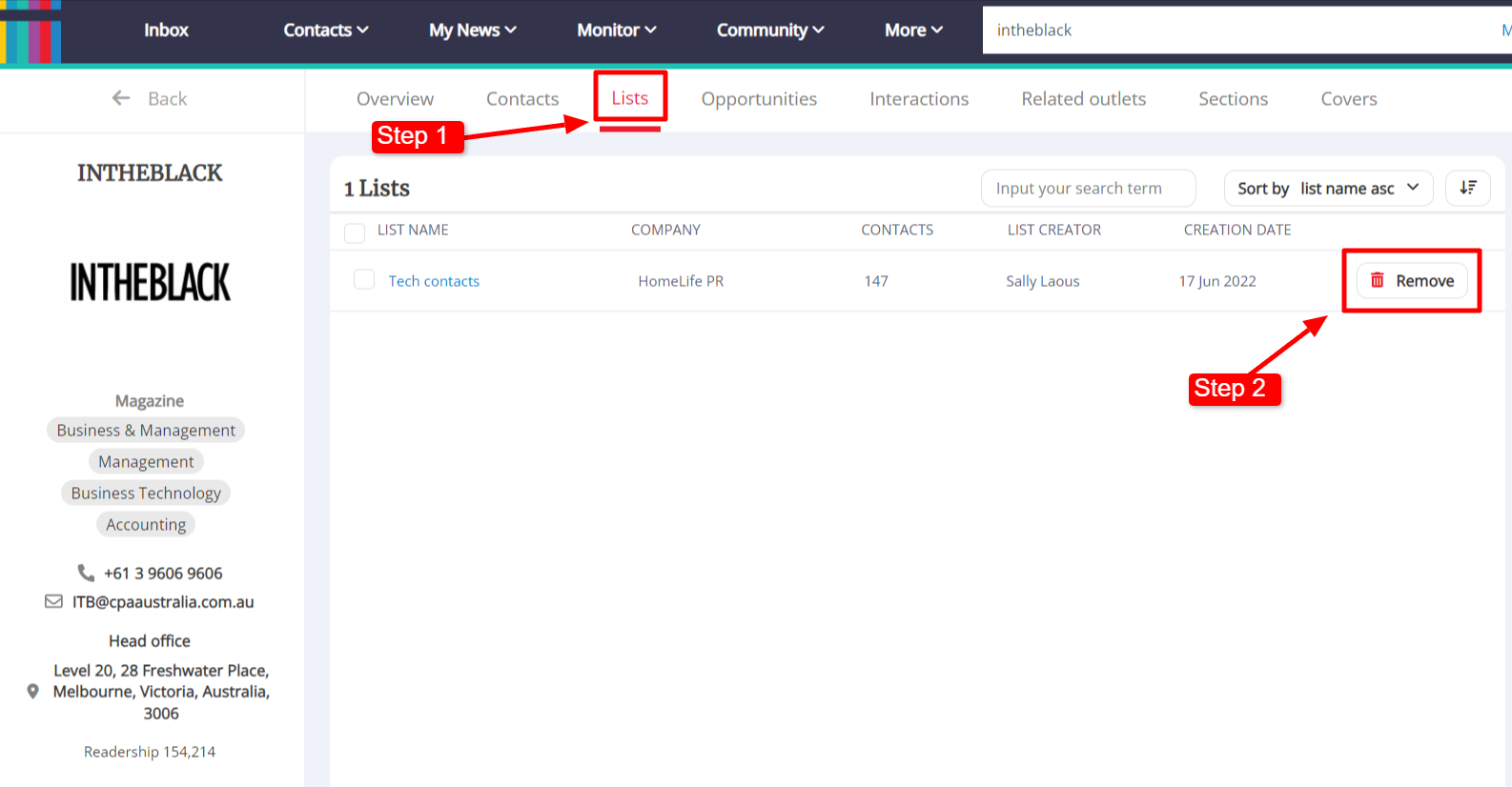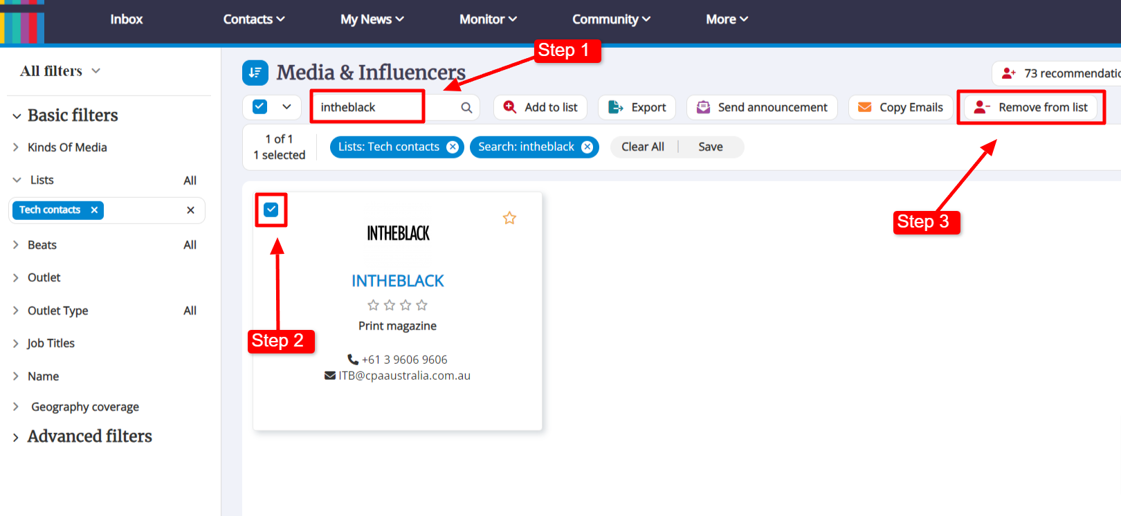 When anyone requests to “unsubscribe” from your media list, you get an email notification. The system won’t remove the contact from your list automatically, so to manually remove them, please follow the steps below. There are 2 ways to do that:
